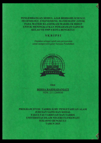 RAHMADANIATI, ROSSA (2025) PENGEMBANGAN MODUL AJAR BERBASIS SCIENCE, TECHNOLOGY, ENGINEERING, MATHEMATIC (STEM) PADA MATERI KLASIFIKASI MAKHLUK HIDUP UNTUK MENINGKATKAN PEMAHAMAN SAINS DI KELAS VII SMP 4 KOTA BENGKULU. Undergraduate (S1) thesis, UIN Fatmawati Sukarno Bengkulu.