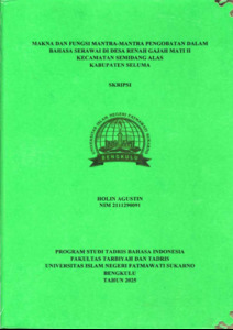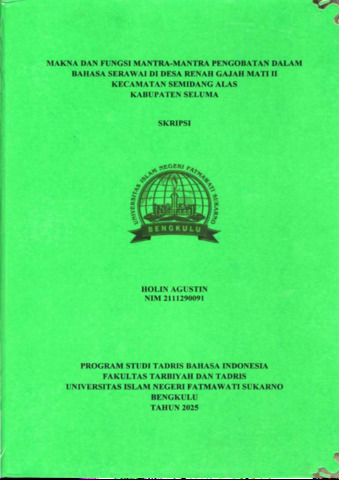 AGUSTIN, HOLIN (2025) MAKNA DAN FUNGSI MANTRA-MANTRA PENGOBATAN DALAM BAHASA SERAWAI DI DESA RENAH GAJAH MATI II KECAMATAN SEMIDANG ALAS KABUPATEN SELUMA. Undergraduate (S1) thesis, UIN Fatmawati Sukarno Bengkulu.
