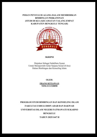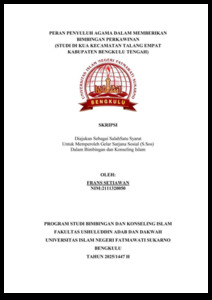SETIAWAN, FRANS (2025) PERAN PENYULUH AGAMA DALAM MEMBERIKAN BIMBINGAN PERKAWINAN (STUDI DI KUA KECAMATAN TALANG EMPAT KABUPATEN BENGKULU TENGAH). Undergraduate (S1) thesis, UIN Fatmawati Sukarno Bengkulu.