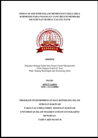JARIA, AINUN (2025) PERAN SUAMI ISTRI DALAM MEMBANGUN KELUARGA HARMONIS PADA PASANGAN YANG BELUM MEMILIKI KETURUNAN DI DESA TALANG PAUH. Undergraduate (S1) thesis, UIN Fatmawati Sukarno Bengkulu.