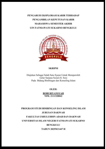 RIYANSYAH, ROBI (2025) PENGARUH EKSPLORASI KARIR TERHADAP PENGAMBILAN KEPUTUSAN KARIR MAHASISWA SEMESTER AKHIR UIN FATMAWATI SUKARNO BENGKULU. Undergraduate (S1) thesis, UIN Fatmawati Sukarno Bengkulu.