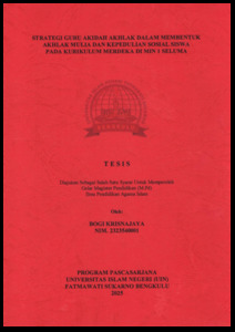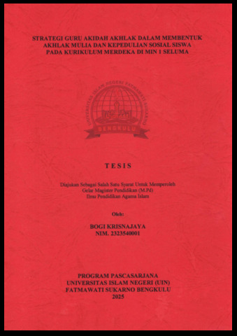 KRISNAJAYA, BOGI (2025) STRATEGI GURU AKIDAH AKHLAK DALAM MEMBENTUK AKHLAK MULIA DAN KEPEDULIAN SOSIAL SISWA PADA KURIKULUM MERDEKA DI MIN 1 SELUMA. Magister (S2) thesis, UIN Fatmawati Sukarno Bengkulu.