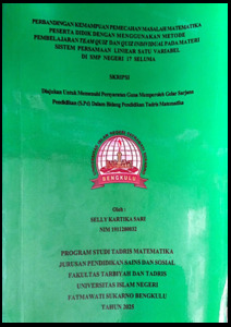 Sari, Selly Kartika (2025) PERBANDINGAN KEMAMPUAN PEMECAHAN MASALAH MATEMATIKA PESERTA DIDIK DENGAN MENGGUNAKAN METODE PEMBELAJARAN TEAM QUIZ DAN QUIZ INDIVIDUAL PADA MATERI SISTEM PERSAMAAN LINIEAR SATU VARIABEL DI SMP NEGERI 17 SELUMA. Undergraduate (S1) thesis, UIN Fatmawati Sukarno Bengkulu.