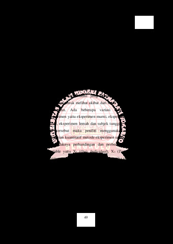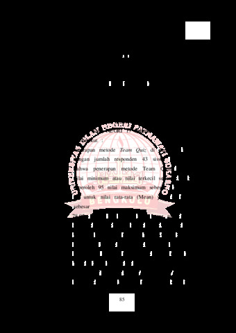 Sekripsi ini merupakan bagian dari program studi Tadris Matematika, Fakultas Tarbiyah dan Tadris, Universitas Islam Negri Fatmawati Sukarno Bengkulu. Penelitian ini di bimbing oleh dua dosen, yaitu pembimbing I Dr. Asmara Yumarni, M.Ag,. dan pembimbing II Dr. Pd. Syaipul Amri, M.Pd. Tujuan penelitian ini adalah untuk mengetahui perbandingan Kemampuan Pemecahan Masalah Matematika Peserta Didik Dengan Menggunakan Metode Pembelajaran Team Quiz Dan Quiz Individual Pada Materi Sistem Persamaan Liniear Satu Variabel Di Kelas VIII SMP Negeri 17 Seluma tahun ajaran 2024-2025. Pendekatan dalam penelitian ini adalah pendekatan kuantitatif dengan menggunakan metode eksprimen. Teknik data menggunakan soal tes. Desain penelitian yang diginakan adalah Quasi Experimental dengan model posttest-only control Design. Populasi dalam penelitian ini adalah seluruh siswa SMPN 17 Seluma tahun ajaran 2024-2025, sedangkan sampelnya adalah adalah seluruh siswa kelas VIII SMPN 17 Seluma tahun ajaran 2024-2025. Untuk menganalisis data, peneliti menggunakan uji Independent Sample T Test. Analisis ini di lakukan dengan bantuan i�㕆�㕃�㕆�㕆 iĀ i31.0.0.0 i117. Dari hasil penelitian deskriptif di dapatkan bahwa dengan jumlah responden 43 siswa menunjukan bahwa penerapan metode quiz individual di peroleh nilai minimum atau nilai terkecil 25, dan di peroleh nilai maksimum sebesar 60. Sementara itu nilai rata-rata (mean) yang di peroleh sebesar 41.28. sementara itu dengann jumlah responden 43 siswa menunjukan bahwa penerapan metode Team Quiz di peroleh nilai minimum atau nilai terkecil sebesar 60, dan di peroleh nilai maksumun sebesar 95. Sementara itu untuk nilai-nilai rata-rata (mean) yang di peroleh sebesar 78.97. hal ini menunjukan bahwa peningkatan kemampuan pemecahan masalah matematika siswa yang di ajarkan menggunakan metode Team Quiz lebih baik di bandingkan dengan siswa yang menggunakan metode Quiz Individual di kelas VIII SMPN 17 Seluma Tahun Ajaran 2024- 2025.