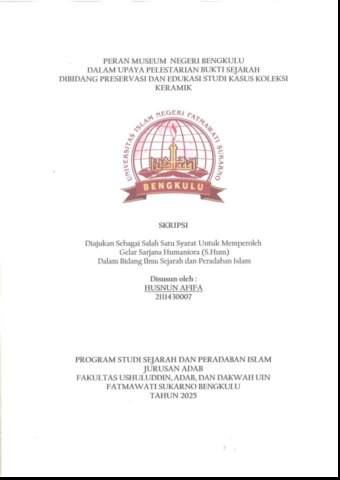 AFIFA, HUSNUN (2025) PERAN MUSEUM NEGERI BENGKULU DALAM UPAYA PELESTARIAN BUKTI SEJARAH DIBIDANG PRESERVASI DAN EDUKASI STUDI KASUS KOLEKSI KERAMIK. Undergraduate (S1) thesis, UIN Fatmawati Sukarno Bengkulu.