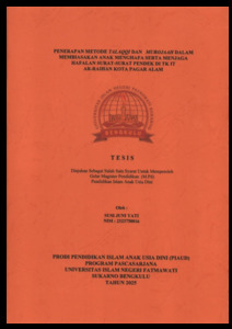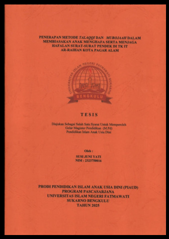 YATI, SUSI JUNI (2025) PENERAPAN METODE TALAQQI DAN MUROJAAH DALAM MEMBIASAKAN ANAK MENGHAFA SERTA MENJAGA HAFALAN SURAT-SURAT PENDEK DI TK IT AR-RAIHAN KOTA PAGAR ALAM. Magister (S2) thesis, UIN Fatmawati Sukarno Bengkulu.
