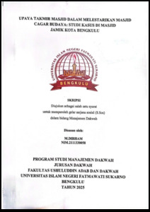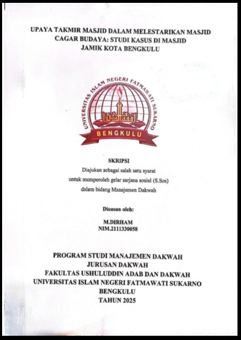 Dirham, M (2025) UPAYA TAKMIR MASJID DALAM MELESTARIKAN MASJID CAGAR BUDAYA: STUDI KASUS DI MASJID JAMIK KOTA BENGKULU. Undergraduate (S1) thesis, UIN Fatmawati Sukarno Bengkulu.