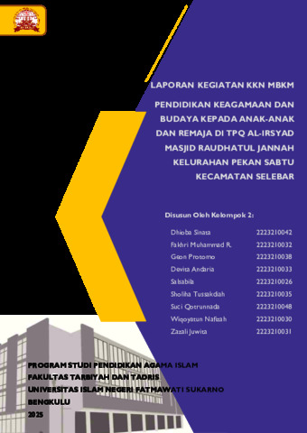 SINTA, DHIOBI and dkk, dkk (2025) LAPORAN KEGIATAN KKN MBKM PENDIDIKAN KEAGAMAAN DAN BUDAYA KEPADA ANAK-ANAK DAN REMAJA DI TPQ AL-IRSYAD MASJID RAUDHATUL JANNAH KELURAHAN PEKAN SABTU KECAMATAN SELEBAR. Project Report. LPPM UIN Fatmawati Sukarno Bengkulu, Bengkulu. (Submitted)