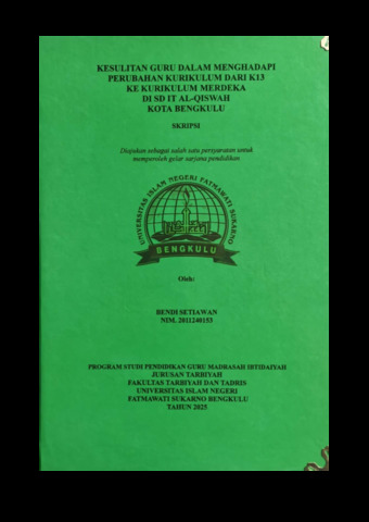 SETIAWAN, BENDI (2024) KESULITAN GURU DALAM MENGHADAPI PERUBAHAN KURIKULUM DARI K13 KE KURIKULUM MERDEKA DI SD IT AL-QISWAH KOTA BENGKULU. Undergraduate (S1) thesis, UIN Fatmawati Sukarno Bengkulu.
